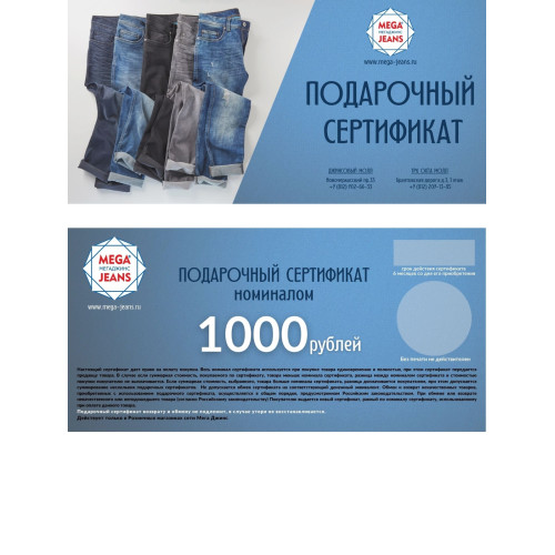 Подарочный Сертификат МЕГА ДЖИНС - номиналом 1000 рублей