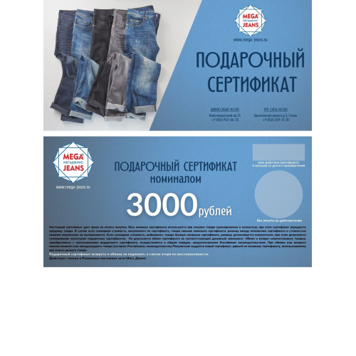 Подарочный Сертификат МЕГА ДЖИНС - номиналом 3000 рублей