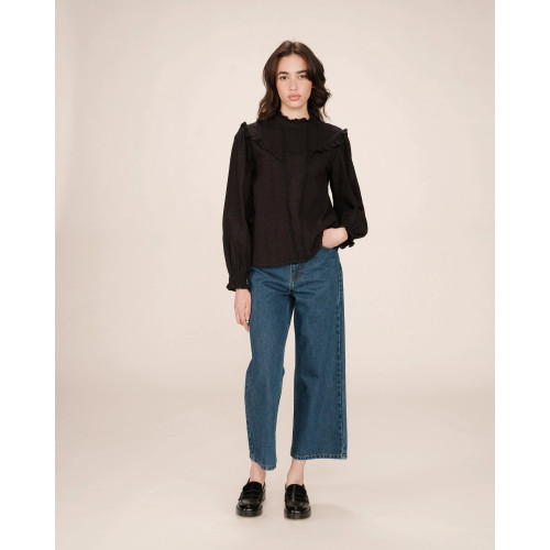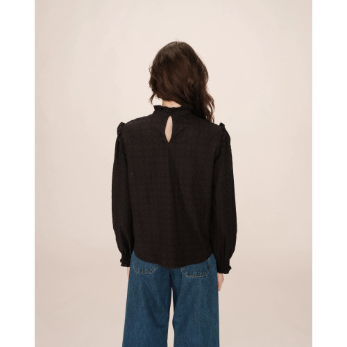 Женская рубашка Grace&Mila из плотного хлопка с вышивкой на ткани в тон, прямого кроя, воротник-стойка, длинный объемный рукав, застежка на пуговицы