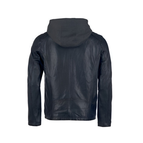 Кожаная мужская куртка Mustang на подкладке, с капюшоном из трикотажа(отстегивающийся), прямого кроя, воротник-стойка, два врезных боковых кармана, длинный рукав, прямая застежка на молнию