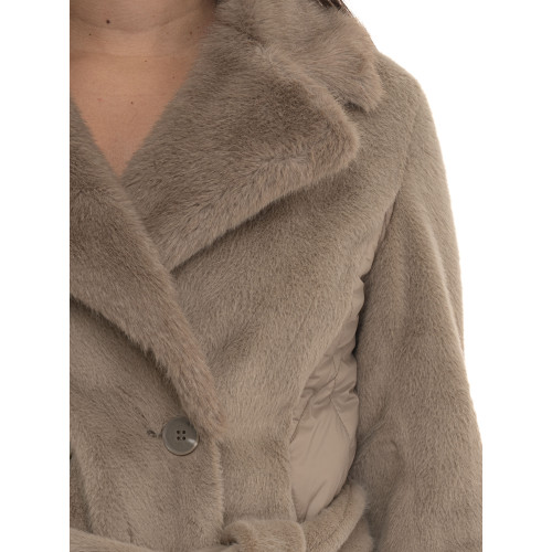 Демисезонное стеганное женское пальто Guess с отделкой из искусственного меха, двубортное, прямого кроя, талия с поясом, отложной воротник-лацкан, два кармана по бокам, длинный рукав, застежка на пуговицы
