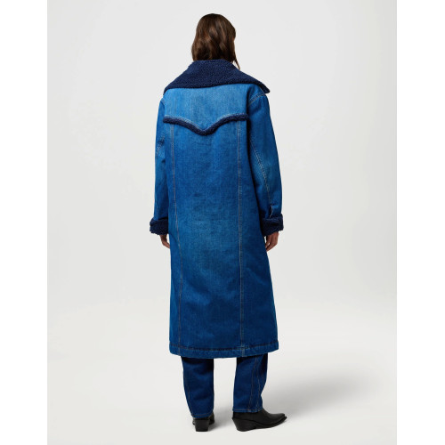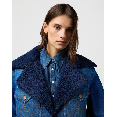 Демисезонная женская удлиненная куртка Wrangler на подкладке из искусственного меха, прямого свободного кроя, отложной воротник-лацкан (отделка-искусственный мех), два широких накладных кармана по бокам, застежка на болтах